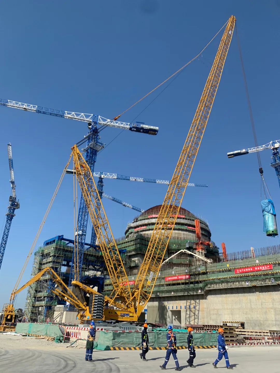近日,有我國核電“國之名片”之稱的“華龍一號”電機組建設(shè)再次提速,福建漳州核電2號機組12臺換熱器全部吊裝就位,閃耀在現(xiàn)場的徐工XGC11000履帶起重機,也為這張“名片”增添了一抹亮眼的金色。 “華龍一號”作為中國核電走向世界的名片,是我國具有完全自主知識產(chǎn)權(quán)的三代壓水堆核電創(chuàng)新成果。換熱器是核島非能動安全殼熱量導(dǎo)出系統(tǒng)的重要組成部分,起到保障安全殼溫度穩(wěn)定的作用。此次需要安裝的換熱器高7.3米,重9.4噸,單機組共12臺,安裝在核島內(nèi)安全殼正37米標(biāo)高處。 傳統(tǒng)換熱器安裝工藝繁瑣復(fù)雜,為加速施工,安全高效作業(yè)。項目一改傳統(tǒng)做法,將換熱器納入“開頂法”設(shè)備清單,模塊化安裝后一體化吊裝就位。作為反應(yīng)堆安全運行的關(guān)鍵“保險”,這類精密設(shè)備的安裝不能有一絲閃失,必須得上“強力輸出”。 同級最長的114米重型主臂、38米幅度最大起升208噸,強悍的性能讓徐工XGC11000 650噸履帶起重機成為了項目方施工首選。此外,徐工XGC11000更是久經(jīng)風(fēng)電場上復(fù)雜風(fēng)速環(huán)境的嚴(yán)苛考驗,可憑借吊裝穩(wěn)定性和施工效率等方面,完美應(yīng)對此次區(qū)域劃分嚴(yán)格、安全等級極高的在建反應(yīng)堆工程。 “這一次起吊半徑30多米,帶載行走了近70米,到達位置后超起全掛,再變幅就位, 100多米的‘飛行’,沒有一點磕碰!” 現(xiàn)場,徐工XGC11000各種輾轉(zhuǎn)騰挪,帶載行走,行云流水般的表現(xiàn),讓機手們形象地稱這個大家伙為“動若龍游,靜如虎踞 ”。根據(jù)不同工況,切換超起輕型主臂132米和超起重型主臂60米兩種工作形態(tài)的精彩操作更是驚艷了客戶。 近年來,徐工履帶起重機多次參建核電工程項目,助力我國核電建設(shè)全面提速,加快由核電大國向核電強國的轉(zhuǎn)變。徐工作為我國裝備制造領(lǐng)域的“國之名片”,也會以絕對領(lǐng)先的實力風(fēng)范,強勢助力“華龍一號”騰起千鈞,乘勢續(xù)發(fā)!