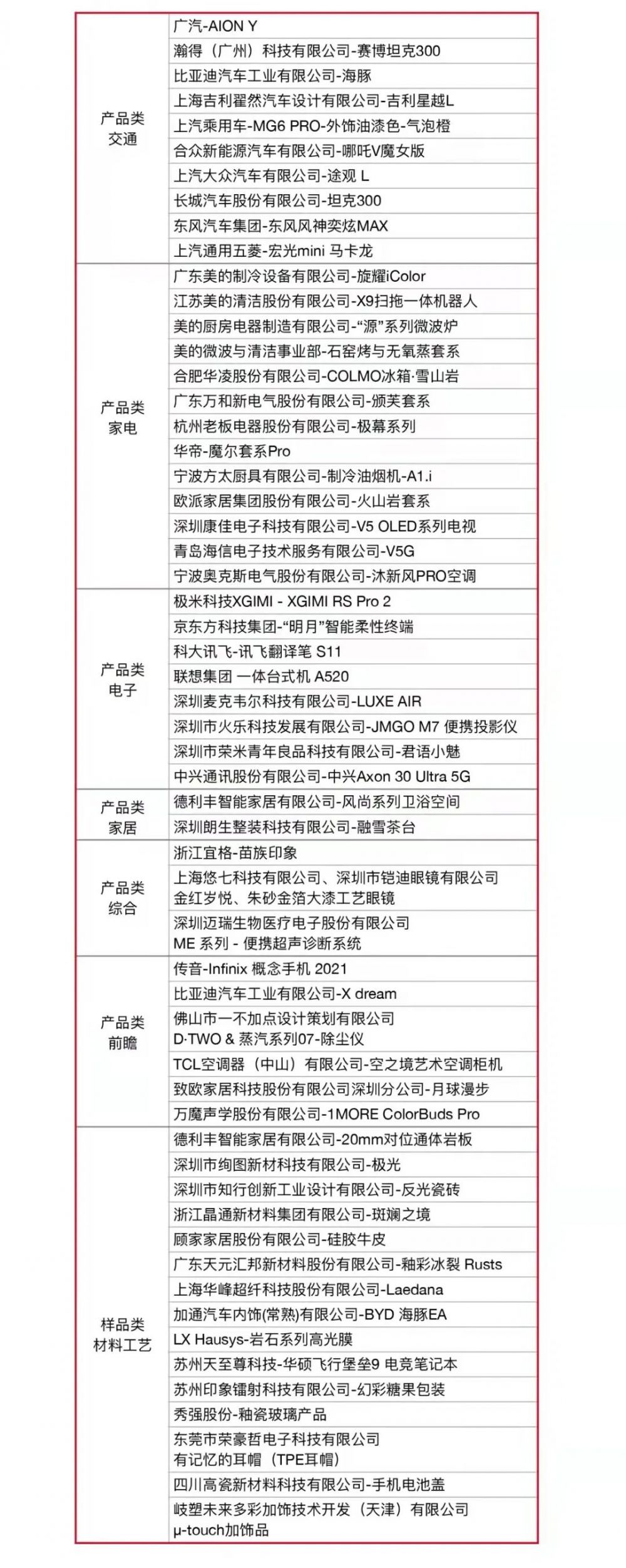 本次參與國際CMF設(shè)計獎評選的企業(yè)有長城汽車、廣汽、上汽、比亞迪、美的、老板電器、華帝、TCL、歐派、萬和、顧家、中興、科大訊飛、LX hausys、秀強(qiáng)等知名終端及供應(yīng)商企業(yè),通過國際CMF設(shè)計獎評委專家的層層評選,最終有56件榮獲:2021國際CMF設(shè)計獎,登上CMF的榮譽(yù)殿堂!產(chǎn)品涵蓋手機(jī)、汽車、家電、家居、材料、工藝等領(lǐng)域。