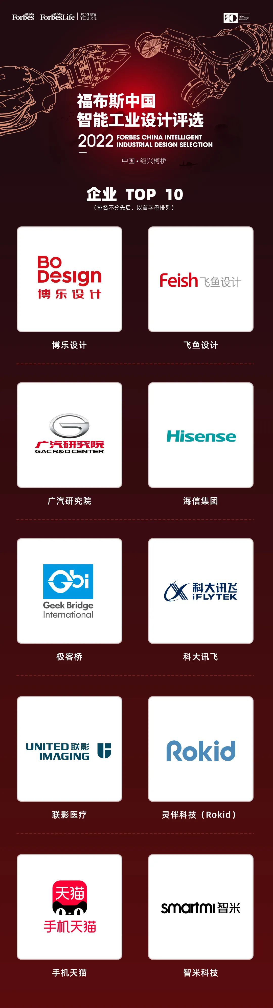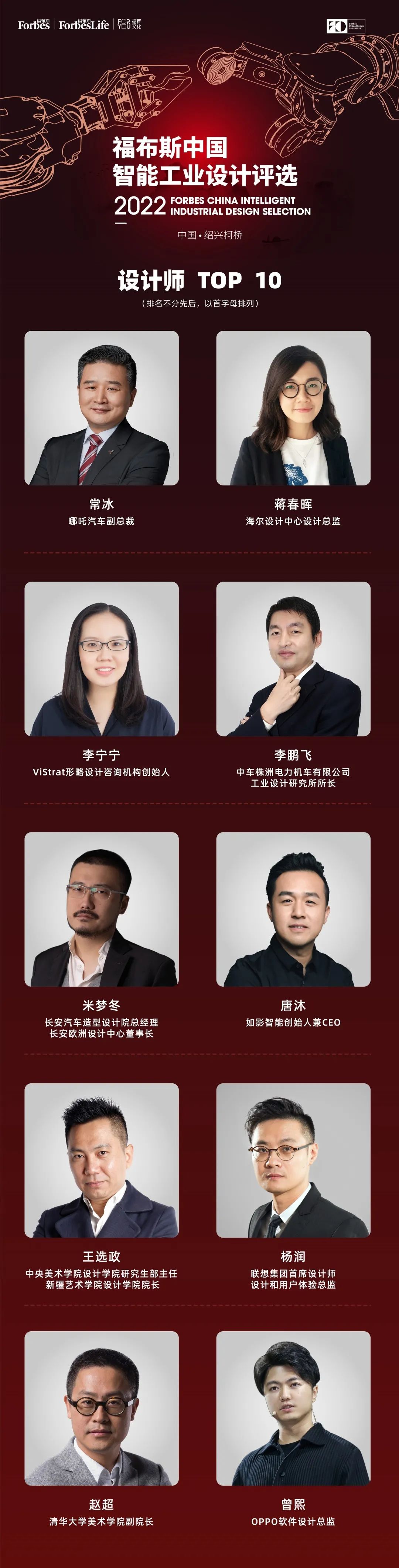 隨著21世紀工業(yè)的發(fā)展與進步,工業(yè)設計不再只是服務于“制造”,“設計”與“制造”之間更是產(chǎn)生了互促互進、互鑒互學的緊密聯(lián)動關系。以人工智能為代表的前沿技術正在涌入工業(yè)設計的產(chǎn)業(yè)鏈,不斷刷新著產(chǎn)品、產(chǎn)業(yè)以及城市的發(fā)展邏輯。 在中國從制造大國向制造強國邁進的道路上,遴選出新產(chǎn)品與新技術的創(chuàng)建者,新業(yè)態(tài)新模式的示范者和引領者,從而利用新一代信息技術,讓設計賦能產(chǎn)品、賦能產(chǎn)業(yè)、賦能城市,以前瞻布局的視野,在創(chuàng)新鏈、產(chǎn)業(yè)鏈的體系下打通上下游,正是此次“2022福布斯中國智能工業(yè)設計評選”的評選方針與重大使命。 2022福布斯中國智能工業(yè)設計評選繼續(xù)聚焦智能工業(yè)領域,在全國范圍內發(fā)掘尋找能代表中國設計力量的優(yōu)秀企業(yè)與設計師,設有“2022福布斯中國智能工業(yè)設計企業(yè)TOP 10”及“2022福布斯中國智能工業(yè)設計師TOP 10”兩大獎項榮譽。自8月10日正式啟動報名征集以來,本次評選收到了大量包括科技創(chuàng)新公司、品牌企業(yè)、專業(yè)設計機構和業(yè)內知名設計師等在內的報名咨詢,候選人數(shù)量較2021年有大幅度增長。 評選組委會邀請了34位國內外行業(yè)知名的專家學者和教授來擔任本次評選的提名專家,評審委員會則由國內8大設計藝術類院校院長級評審陣容組成,這保證了評選一貫的權威性和公正性。 本次評選從五大維度及十五條標準來開展專業(yè)細致的評審:社會意義,要從審美、經(jīng)濟、科技等多方面對社會發(fā)展產(chǎn)生推動作用;商業(yè)價值,在生產(chǎn)、消費、交易中產(chǎn)生較高經(jīng)濟價值,具有廣泛市場影響力;產(chǎn)業(yè)驅動力,對所在行業(yè)起到引領作用,能驅動產(chǎn)業(yè)發(fā)展;創(chuàng)新突破,以創(chuàng)新性與創(chuàng)造力引領新產(chǎn)業(yè)、新業(yè)態(tài)發(fā)展;影響力,具有前瞻性,能迎合未來的發(fā)展與變革。 評選組委會實地走訪企業(yè)、機構,對評選模型進行研究,并廣泛聽取了業(yè)內專家學者的意見,經(jīng)過專家提名、報名征集、資格審核、走訪考察、評審初評終評等環(huán)節(jié)的層層篩選,同時結合福布斯中國產(chǎn)業(yè)研究機構提供的企業(yè)相關數(shù)據(jù),兼顧行業(yè)、企業(yè)平衡等因素綜合考量,最終產(chǎn)生了TOP 10名單。 企業(yè) TOP 10: 在評選智能工業(yè)設計企業(yè)的過程中,除了五大維度,本次評選還從八條細則著手,包括企業(yè)的市值/估值、企業(yè)的營收、企業(yè)的作品數(shù)量、數(shù)智創(chuàng)新力、業(yè)內影響力(是否推動中國工業(yè)智能化或設計創(chuàng)新發(fā)展)、所設計品牌的市場影響力、曾獲獎項等方面來綜合評價。 本次評選不以企業(yè)規(guī)模大小論成敗,在關注企業(yè)市值的同時,也重視企業(yè)在創(chuàng)新領域的投入和其社會意義的體現(xiàn),以兼顧不同行業(yè)、不同企業(yè)之間的平衡,目的是讓這個評選可以鼓勵更多類型的創(chuàng)新企業(yè)——這其中既要肯定大企業(yè)、大品牌持續(xù)創(chuàng)新、自我迭代的努力,也要褒獎創(chuàng)新公司、設計公司的設計突破、設計創(chuàng)造社會價值的貢獻。 本次獲獎企業(yè)中包含了制造類公司、互聯(lián)網(wǎng)公司、創(chuàng)新公司、設計公司等多種不同企業(yè)類型,既有注重設計創(chuàng)新的、擁有一定規(guī)模產(chǎn)值的龍頭企業(yè),也有服務過眾多品牌及大型廠商的國內知名設計機構,而擁有獨特技術創(chuàng)新、設計創(chuàng)新的創(chuàng)新科技企業(yè)也占有一席之地,他們都展示出了蓬勃的中國設計創(chuàng)新力量。 設計師 Top 10: 在評選智能工業(yè)設計師時,本次評選從七條細則,包括個人教育背景、主導或參與的設計項目、個人所獲成就和其他獎項、業(yè)內影響力(是否使用現(xiàn)代高科技解決工業(yè)領域問題)、數(shù)智創(chuàng)新力、所設計品牌的市場影響力等方面來進行評價。評選不以資歷來論成敗,既參考學術研究方面的成績,也重視設計成果的轉化與實績。入選者既有在學術方面具備亮眼成績、推動行業(yè)發(fā)展的設計者,也有實戰(zhàn)經(jīng)驗豐富、推動企業(yè)設計迭代、開創(chuàng)創(chuàng)新設計體系的資深設計師,而且獲獎者的設計成果中不乏在疫情中發(fā)揮出巨大作用的產(chǎn)品。 在此,真誠祝愿此次入選的企業(yè)與設計師,希望他們能夠繼續(xù)在行業(yè)內發(fā)光發(fā)熱,在數(shù)據(jù)化、智能化的加持下,將“設計”“科技”“商業(yè)”三者有機結合,掀起中國工業(yè)一輪又一輪的革命性突破!