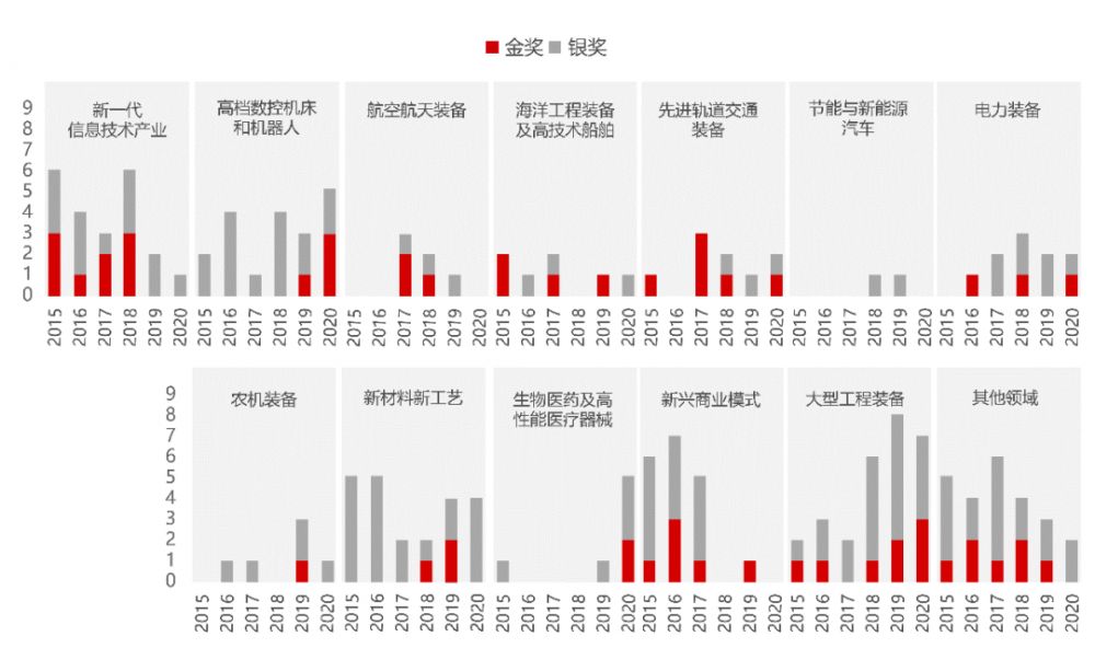 “好設(shè)計(jì)獎(jiǎng)”評(píng)選和研究案例廣泛來源于國(guó)家經(jīng)濟(jì)和社會(huì)發(fā)展過程中的杰出創(chuàng)新案例,覆蓋“產(chǎn)品、系統(tǒng)及工程設(shè)計(jì)、工藝流程及技術(shù)設(shè)計(jì)、商業(yè)模式與業(yè)態(tài)創(chuàng)新”等領(lǐng)域。在2015-2020年間,“好設(shè)計(jì)獎(jiǎng)”舉辦六屆,累計(jì)評(píng)選出金獎(jiǎng)58項(xiàng)、銀獎(jiǎng)122項(xiàng),聚焦在《中國(guó)制造2025》擬重點(diǎn)支持的十大領(lǐng)域。數(shù)據(jù)顯示:大型工程裝備、新一代信息技術(shù)、新材料新工藝是熱門獲獎(jiǎng)?lì)I(lǐng)域,分別累計(jì)獲獎(jiǎng)28項(xiàng)、22項(xiàng)以及22項(xiàng),其中,大型工程裝備領(lǐng)域獲獎(jiǎng)數(shù)量最多。對(duì)180項(xiàng) “好設(shè)計(jì)獎(jiǎng)”金銀獎(jiǎng)獲獎(jiǎng)案例的申報(bào)數(shù)據(jù)分析發(fā)現(xiàn),“技術(shù)”、“服務(wù)”、“系統(tǒng)”、“智能”、“機(jī)器人”等關(guān)鍵詞成為代表我國(guó)制造業(yè)創(chuàng)新設(shè)計(jì)的重要特征。
