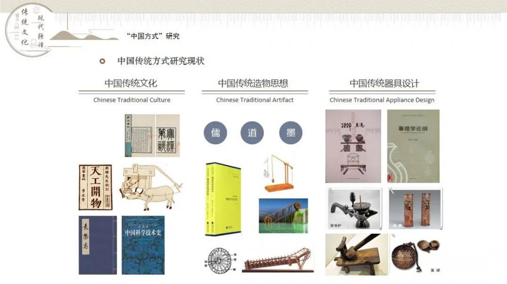 從中國傳統(tǒng)文化到傳統(tǒng)的造物現(xiàn)代,我們其實(shí)即有理論層面,也有思維層面,在傳統(tǒng)設(shè)計(jì)層面有幾部分的學(xué)術(shù)研究工作,包括中國傳統(tǒng)文化,中國傳統(tǒng)造物思想,中國傳統(tǒng)器具設(shè)計(jì)。