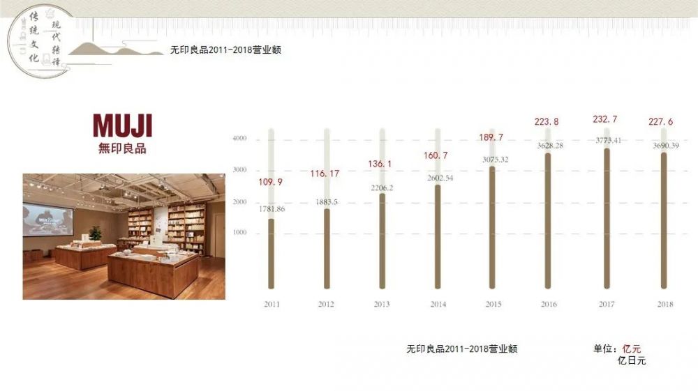 從11年到18年無印良品的營業(yè)額不斷增長,分析其本質(zhì)是其用了一個(gè)理念叫做“減速的東方生活哲學(xué)”。在全球700多家店里面中國占400多家,中國講起來雖然是是東亞文化的中國,但是卻反過來消費(fèi),由日本反向循環(huán)到本土市場,這對我們來說是需要反思的一個(gè)方向。