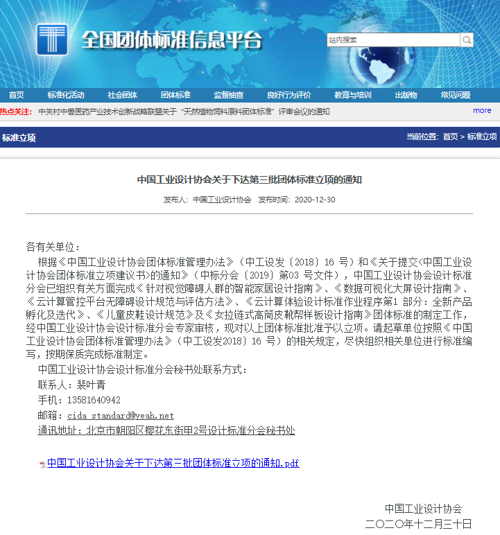 根據(jù)《中國工業(yè)設(shè)計(jì)協(xié)會團(tuán)體標(biāo)準(zhǔn)管理辦法》(中工設(shè)發(fā)﹝2018﹞16 號)和《關(guān)于提交<中國工業(yè)設(shè)計(jì)協(xié)會團(tuán)體標(biāo)準(zhǔn)立項(xiàng)建議書>的通知》(中標(biāo)分會﹝2019﹞第03 號文件),中國工業(yè)設(shè)計(jì)協(xié)會設(shè)計(jì)標(biāo)準(zhǔn)分會已組織有關(guān)方面完成《針對視覺障礙人群的智能家居設(shè)計(jì)指南》、《數(shù)據(jù)可視化大屏設(shè)計(jì)指南》、《云計(jì)算管控平臺無障礙設(shè)計(jì)規(guī)范與評估方法》、《云計(jì)算體驗(yàn)設(shè)計(jì)標(biāo)準(zhǔn)作業(yè)程序第1部分:全新產(chǎn)品孵化及迭代》、《兒童皮鞋設(shè)計(jì)規(guī)范》及《女拉鏈?zhǔn)礁咄财ぱ蜆影逶O(shè)計(jì)指南》團(tuán)體標(biāo)準(zhǔn)的制定工作,經(jīng)中國工業(yè)設(shè)計(jì)協(xié)會設(shè)計(jì)標(biāo)準(zhǔn)分會專家審核,現(xiàn)對以上團(tuán)體標(biāo)準(zhǔn)批準(zhǔn)予以立項(xiàng)。 公示文件已于2020年12月30日公示至中國國家標(biāo)準(zhǔn)化管理委員會全國團(tuán)體標(biāo)準(zhǔn)信息平臺:http://www.ttbz.org.cn/Home/Show/20771 附件:中國工業(yè)設(shè)計(jì)協(xié)會關(guān)于下達(dá)第三批團(tuán)體標(biāo)準(zhǔn)立項(xiàng)的通知.pdf