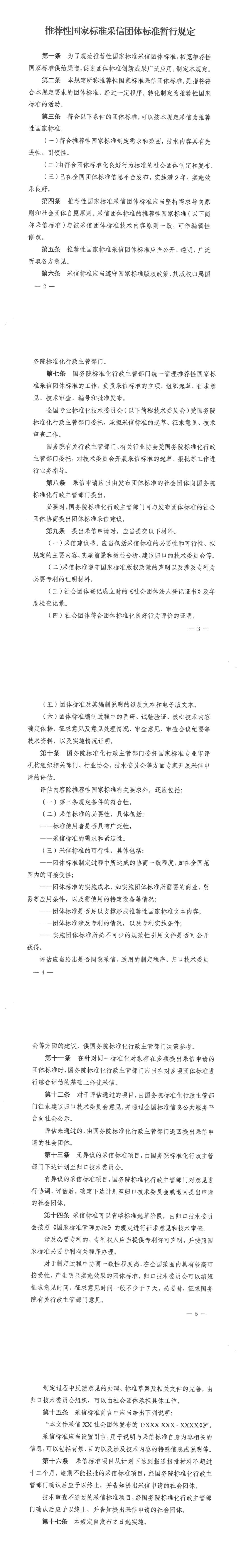 8月8日,國家標(biāo)準(zhǔn)化管理委員會(huì)印發(fā)《推薦性國家標(biāo)準(zhǔn)采信團(tuán)體標(biāo)準(zhǔn)暫行規(guī)定》(以下簡稱《暫行規(guī)定》)?!稌盒幸?guī)定》結(jié)合我國現(xiàn)有推薦性國家標(biāo)準(zhǔn)和團(tuán)體標(biāo)準(zhǔn)特點(diǎn),在推薦性國家標(biāo)準(zhǔn)工作機(jī)制基礎(chǔ)上,暢通渠道、簡化程序、縮短時(shí)間,規(guī)范國家標(biāo)準(zhǔn)采信團(tuán)體標(biāo)準(zhǔn)程序。 《暫行規(guī)定》的出臺(tái),搭建了先進(jìn)適用團(tuán)體標(biāo)準(zhǔn)轉(zhuǎn)化為國家標(biāo)準(zhǔn)的渠道,將有效促進(jìn)團(tuán)體標(biāo)準(zhǔn)創(chuàng)新成果推廣應(yīng)用,增加推薦性國家標(biāo)準(zhǔn)供給,提升國家標(biāo)準(zhǔn)質(zhì)量水平。 國家標(biāo)準(zhǔn)化管理委員會(huì)關(guān)于印發(fā)《推薦性國家標(biāo)準(zhǔn)采信團(tuán)體標(biāo)準(zhǔn)暫行規(guī)定》的通知